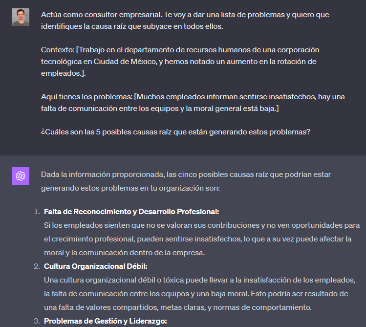 Pídele a ChatGPT que analice tu problema y sugiera posibles causas raíz. Con toda la información y sin dejarse llevar por las emociones, podría identificar patrones que tú has pasado por alto.