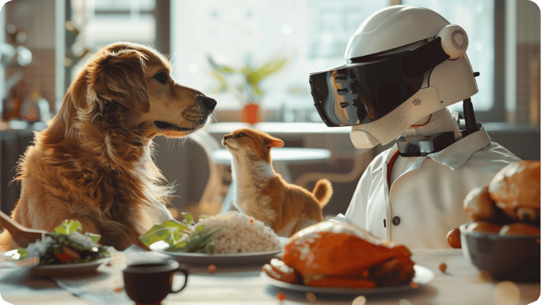 Todas nuestras mascotas felices porque el VeterinarioIA recomienda arroz con pollo | Hecho en Midjourney