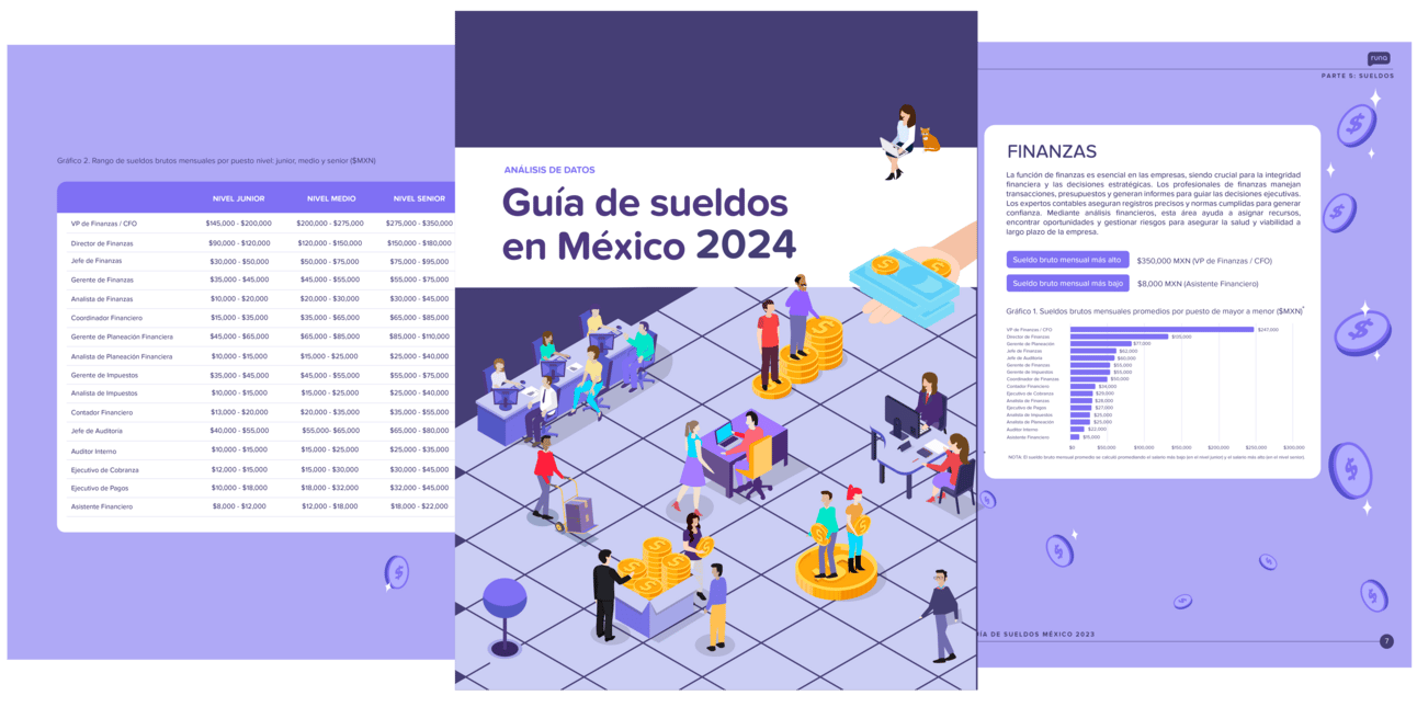 ¿Quieres saber qué sueldos debería ofrecer tu empresa? Su informe cubre el rango de sueldos por área, el promedio salarial de más de 150 puestos de diferentes áreas, y tendencias salariales que te explican cómo se ve la compensación en los puestos de mayor demanda.