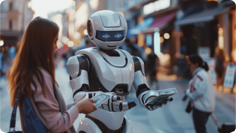 El robot dándome mi ingreso básico universal y diciéndome que no me lo vuelva a gastar todo en outfits para mi perro