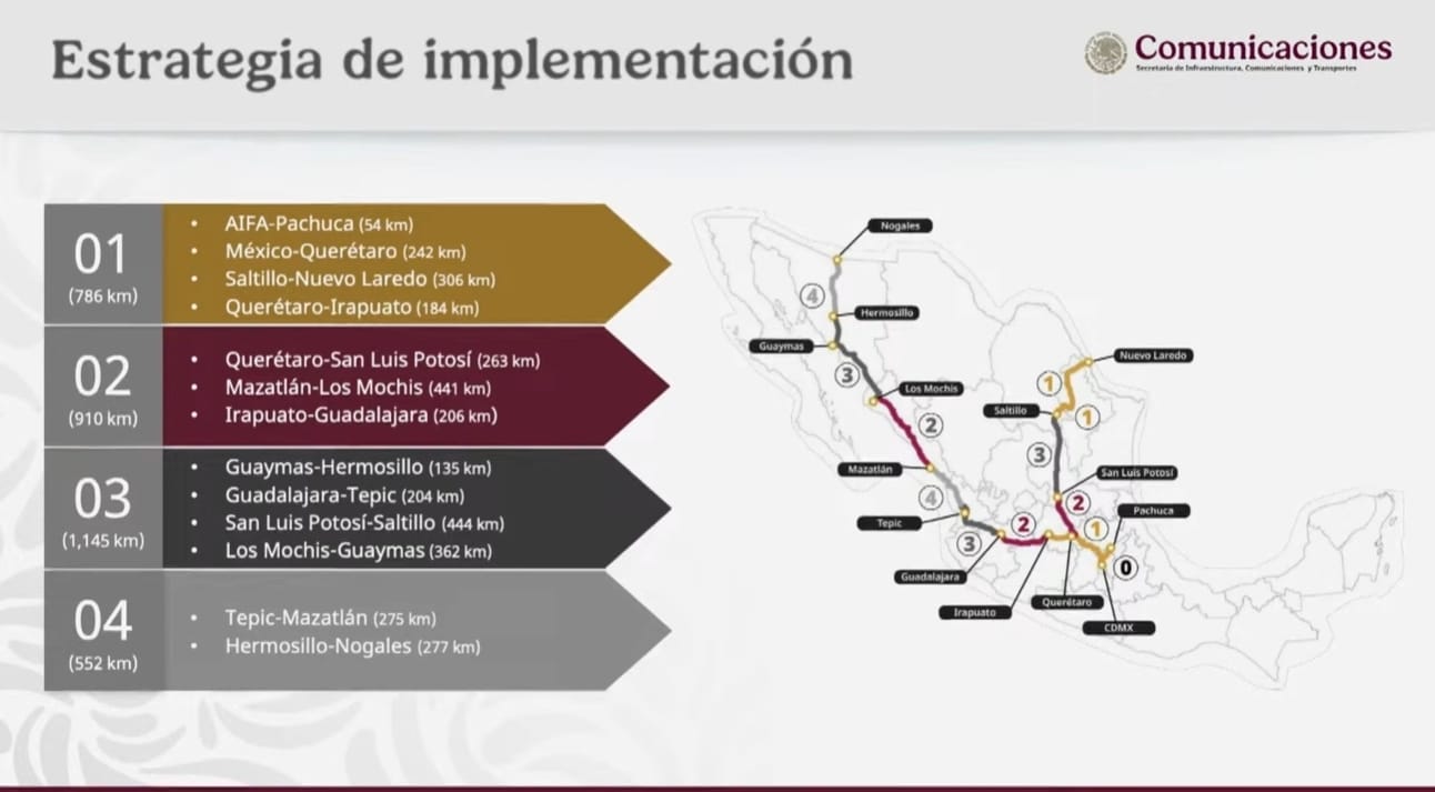 Segunda fase será Querétaro-San Luis Potosí, Mazatlán-Los Mochis e Irapuato-Guadalajara; tercera fase será Guaymas-Hermosillo, Guadalajara-Tepic, SLP-Saltillo y Los Mochis-Guaymas; cuarta será Tepic-Mazatlán y Hermosillo-Nogales. Ajá, son 13 rutas en total.