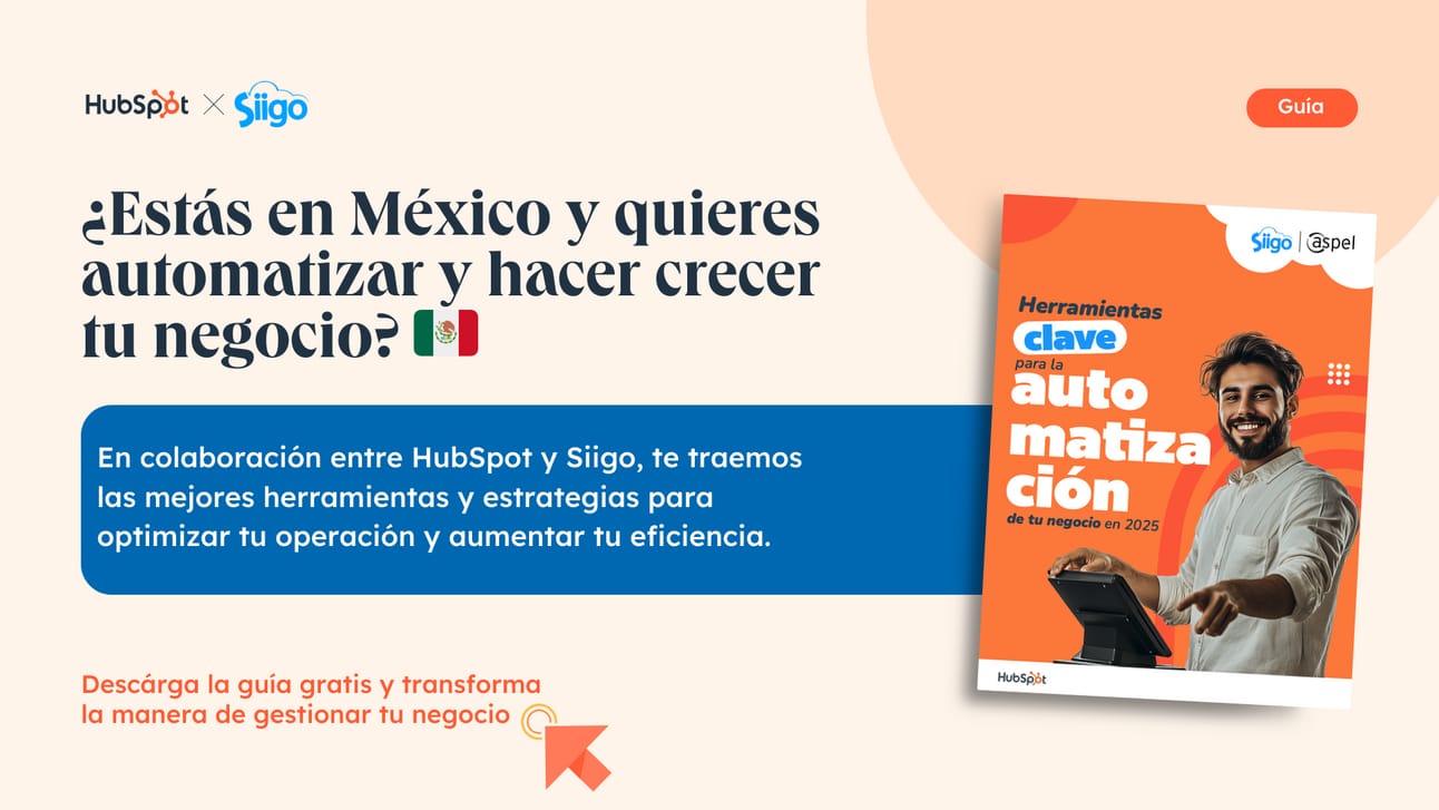 La automatización no es un lujo, es la jugada maestra para hacer tu empresa más eficiente (y rentable). Menos trabajo manual, menos errores, más crecimiento. HubSpot y Siigo lo saben, así que armaron esta guía gratuita específicamente para empresas mexicanas con todo lo que necesitas para empezar.