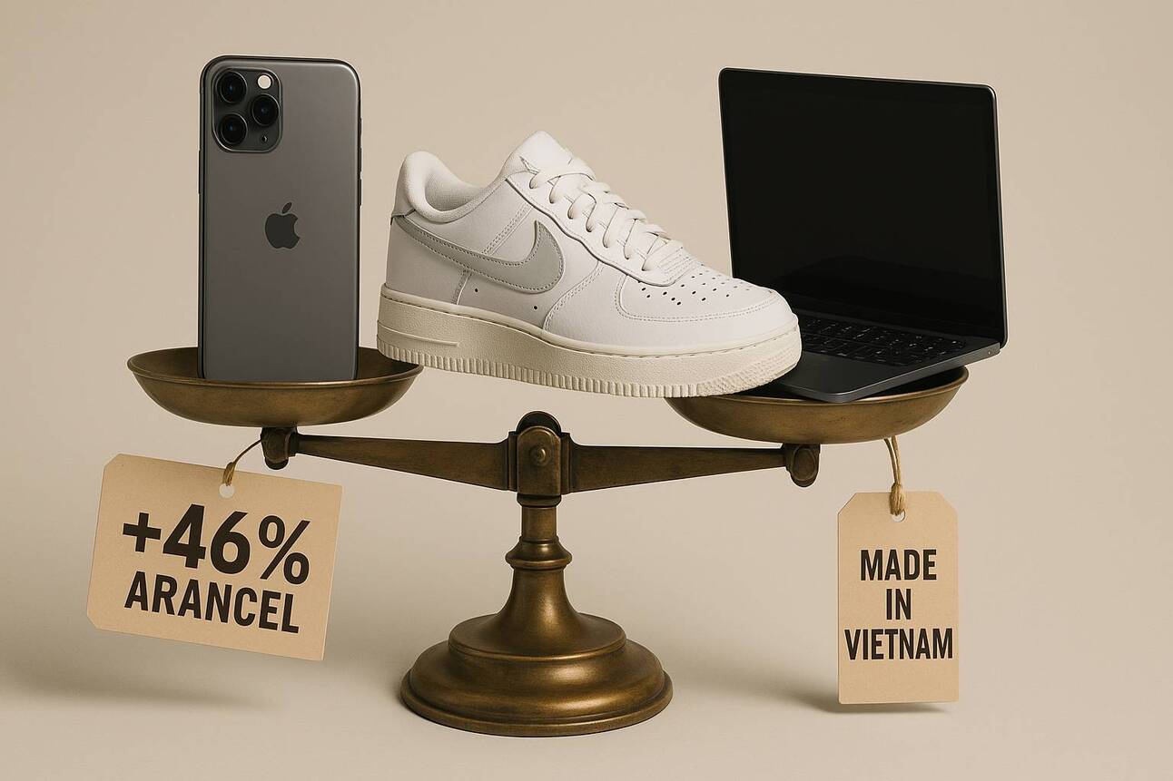 Zoom in: Nike se la lleva particularmente mal. Su caída es del 14.4% y el porqué es simple: la mitad de su calzado y el 28% de su ropa viene de Vietnam, el país que acaba de ser castigado con 46% de aranceles.