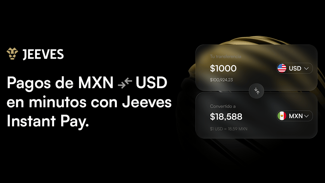 Jeeves Instant Pay convierte tus pesos mexicanos en dólares instantáneamente. Pagas en MXN. Ellos reciben USD. Punto.