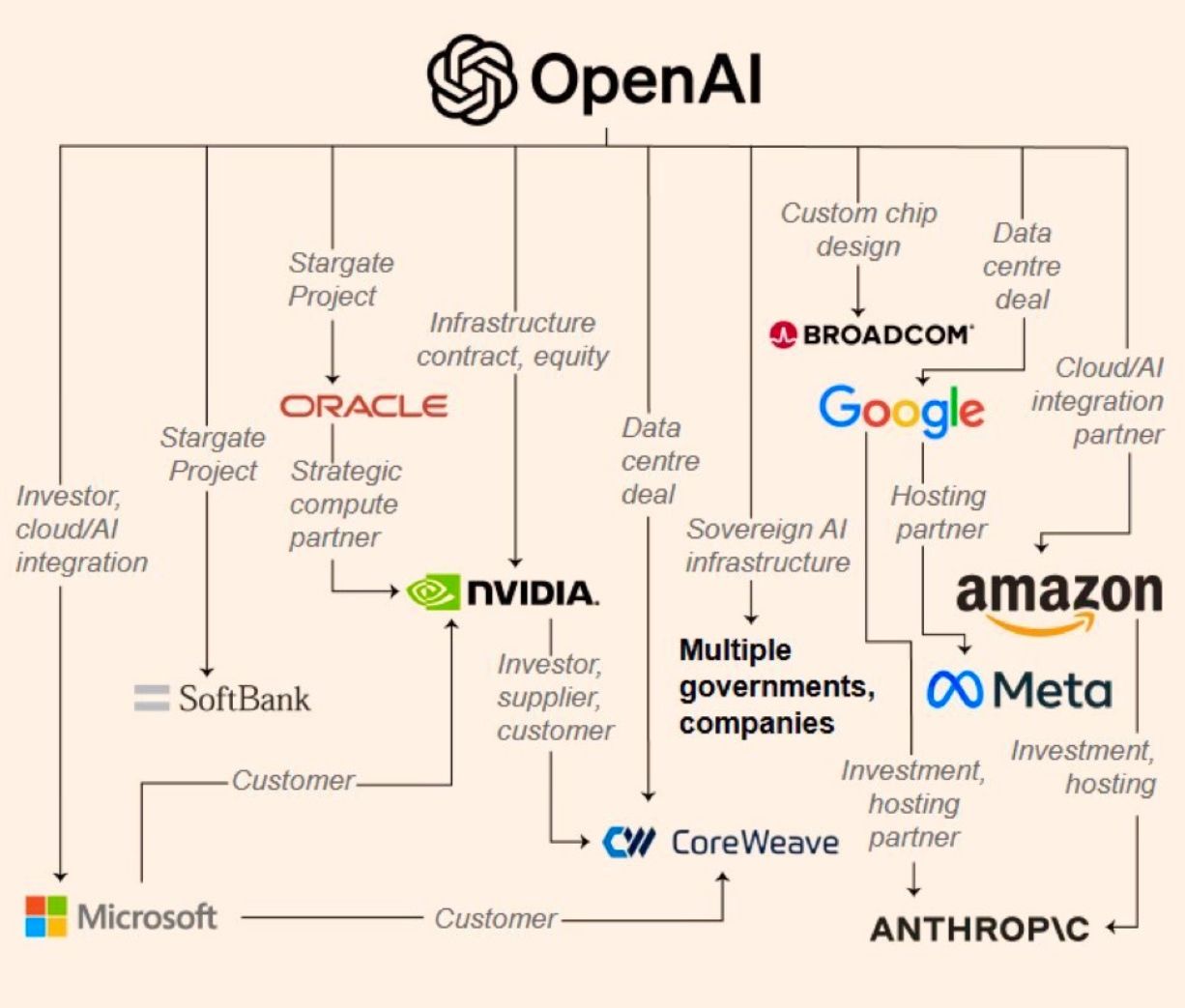 Nvidia tiene capital en xAI, que a su vez le compra hardware a Nvidia; a la par, Nvidia tiene inversiones en Intel, CoreWeave y OpenAI, y este último a su vez usa el dinero de Nvidia para comprarle chips. Además, OpenAI tiene inversiones en AMD, mientras le provee de servicios a Microsoft… que también le compra a Nvidia.