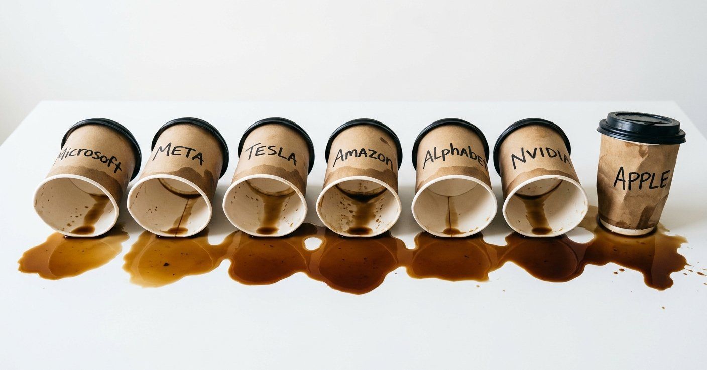 Es una barbaridad. Cada dólar que pusiste en las 7 Magníficas en octubre vale hoy 70 centavos. Microsoft: -32.5% desde su máximo de octubre. Meta: -30.7%; Tesla otro -24%. Amazon y Alphabet: -18.3% cada una. Nvidia: -17.3%. Apple es la menos golpeada con -11.6%.