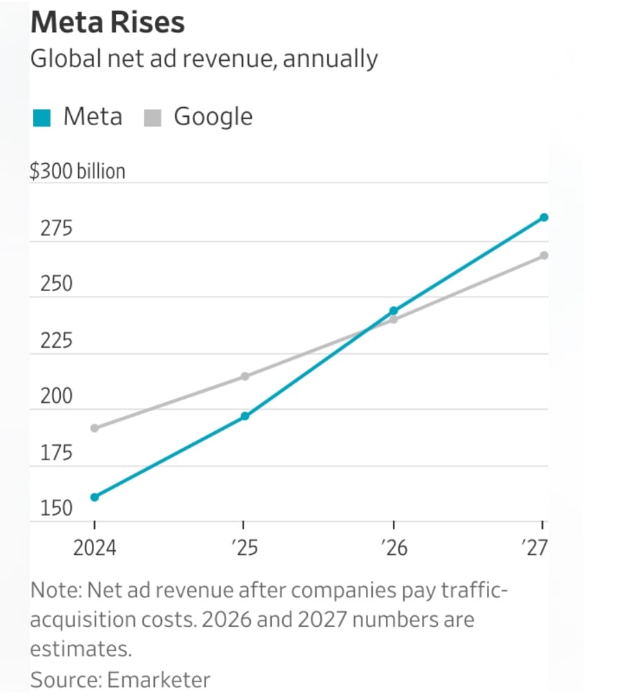 Emarketer acaba de proyectar que Meta superará a Google en ingresos por publicidad este año. 243,000 millones de dólares contra 239,000 millones. Primera vez en la historia.