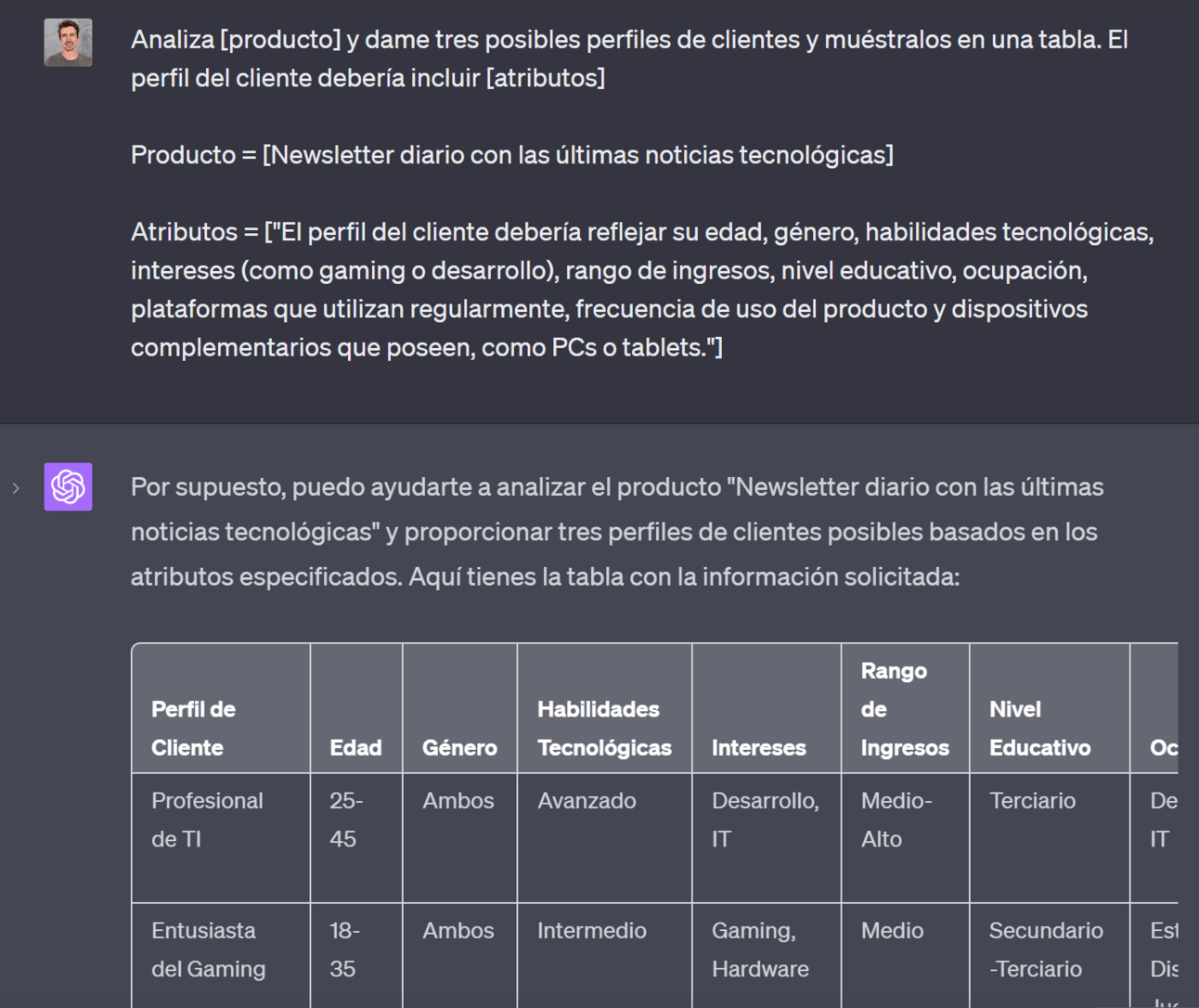 Analiza [producto] y dame tres posibles perfiles de clientes y muéstralos en una tabla. El perfil del cliente debería incluir [atributos]