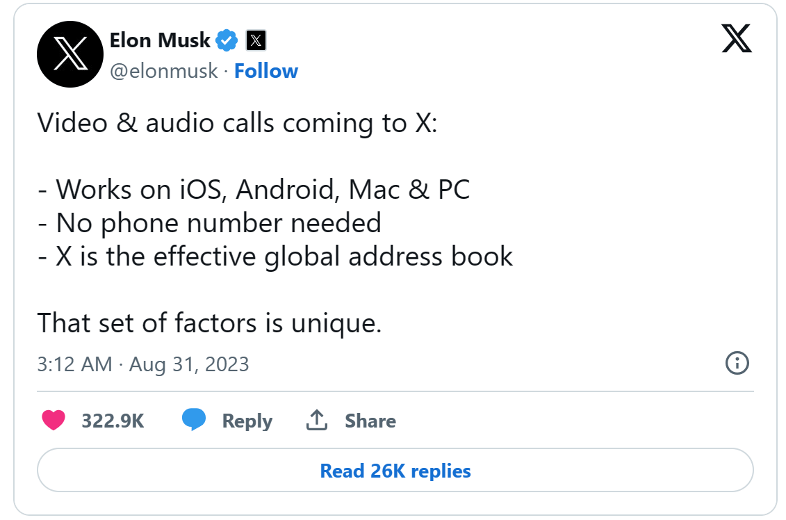 📱 X se convierte en 'Todo en Uno': Elon Musk revela que X incluirá llamadas de video y audio sin necesidad de compartir tu número telefónico. Busca que X se asemeje más a WeChat, la super-aplicación china que ofrece desde redes sociales hasta servicios fintech.